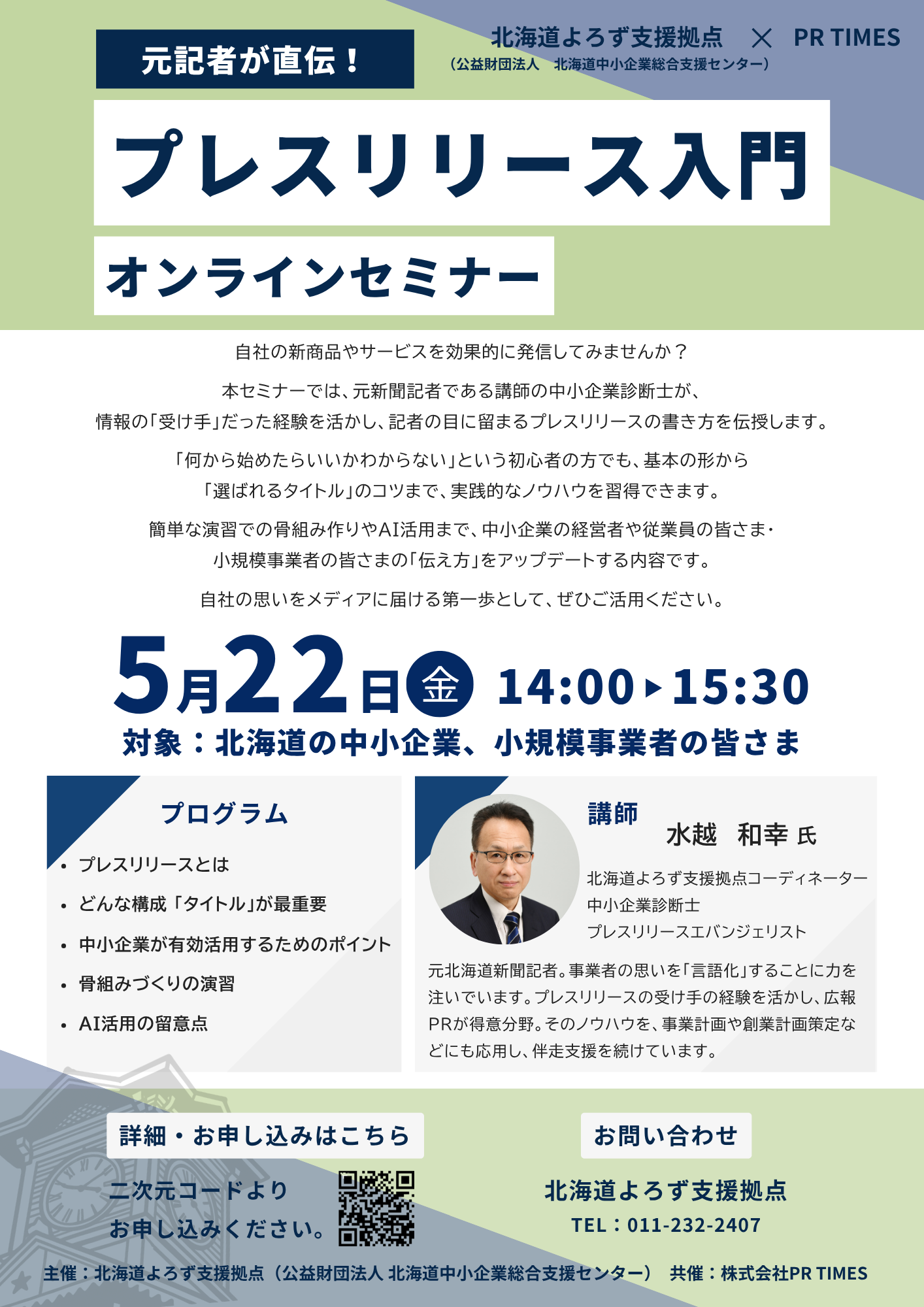5/22 <北海道よろず支援拠点×PR TIMES> 「元記者が直伝!プレスリリース入門オンラインセミナー」開催のご案内